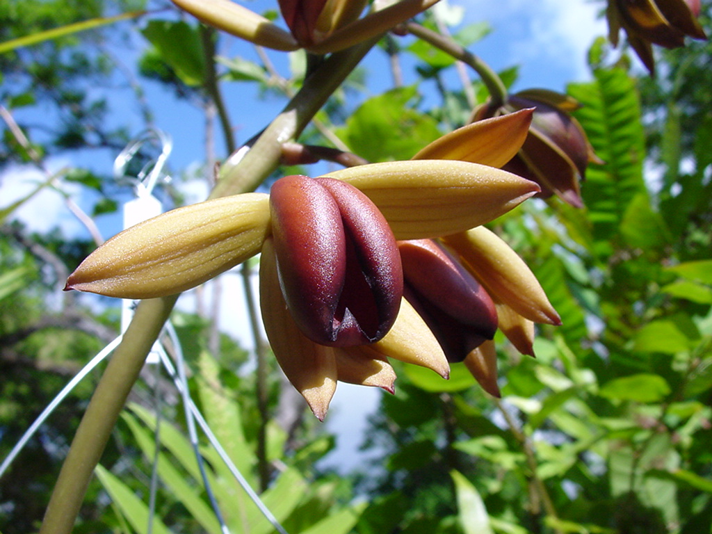 低地の熱帯雨林に生育する着生ランです。多くの葉をつけた肉質の偽球茎の途中から花茎を生じます。(Catasetumは偽球茎の基部から花茎を伸ばす。) Catasetinae亜連のランは雌雄異花です。