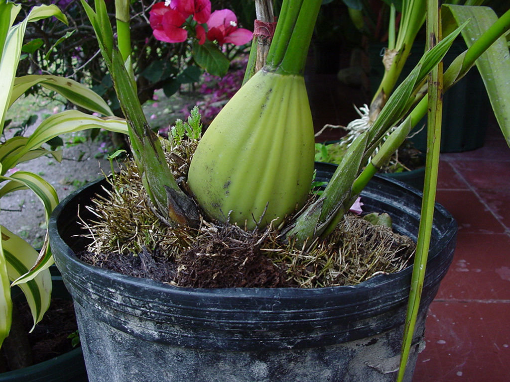 大型の卵型の偽球形に2枚の縦にしわのある長い葉をつけます。
