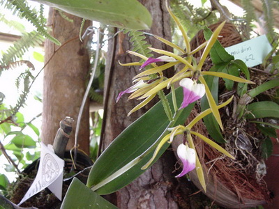 メキシコからパナマまで中米に広く分布しています。偽球形の頂部から長い花茎を伸ばし、唇弁の先端部が赤紫の特徴的な花をつけます。花期は12月~2月ごろの乾季です。