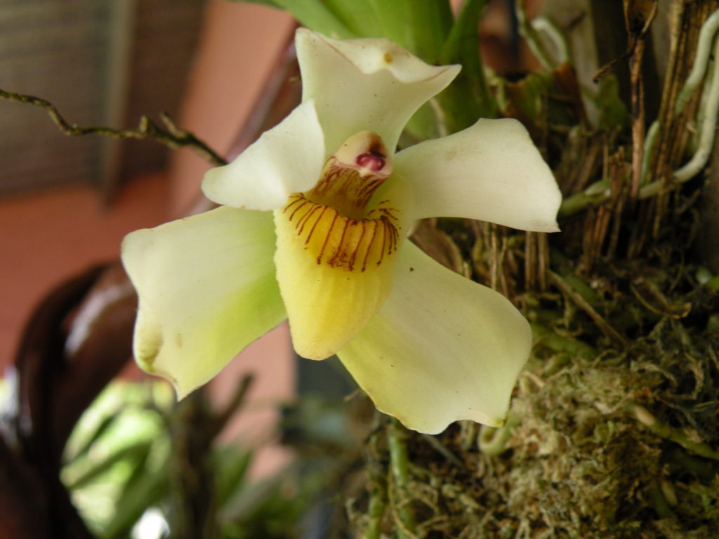 コスタリカ、パナマとコロンビアの太平洋側に分布します。熱帯雨林の高木に着生するランで、短い花梗に一つの、袋状のリップを持つ、クリーム色の美しい花をつけます。1、2月の乾季以外は一年中花が見られます。