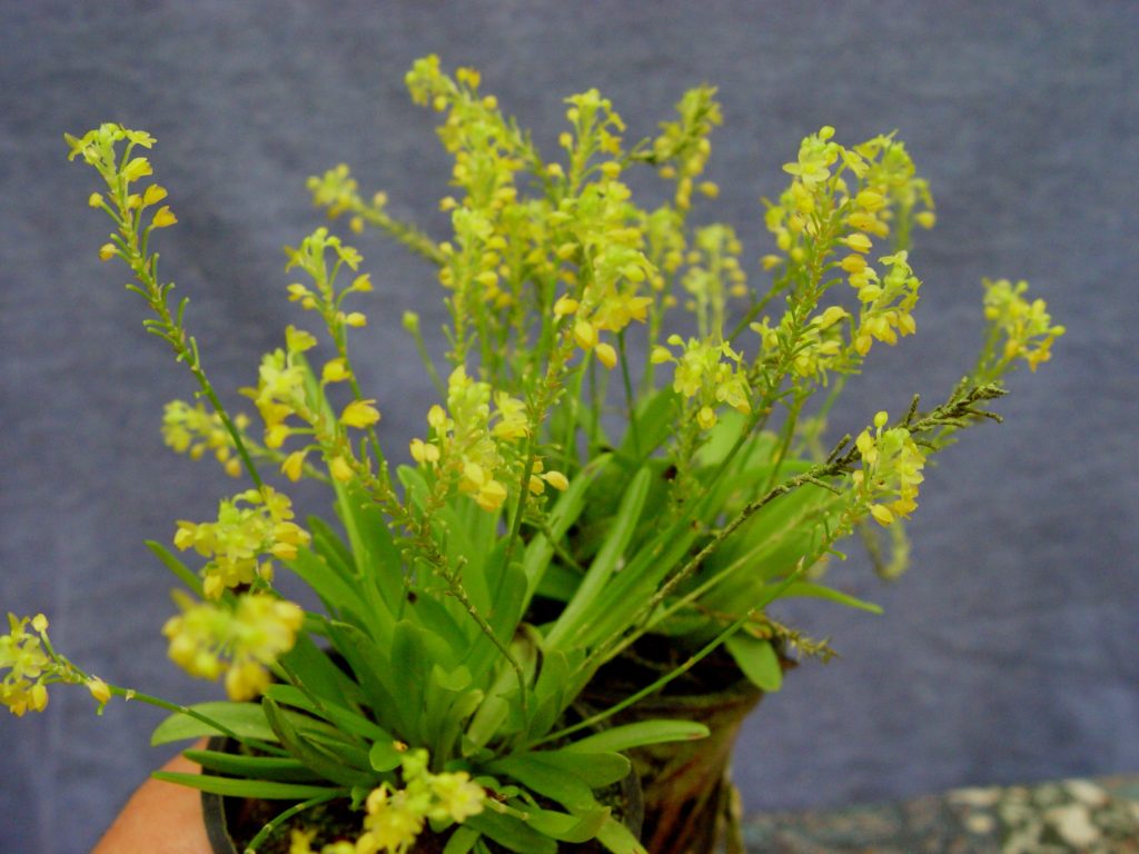 短い葉柄を持った 小型のランで 細い卵型の葉を叢生し、多数の花をつけます。